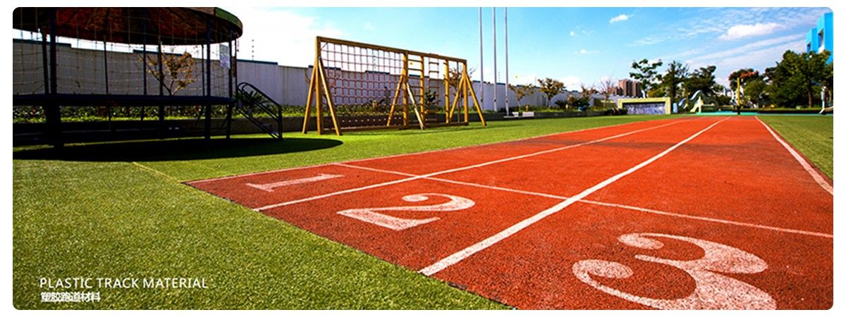 塑胶跑道面层材料主要为聚氨脂(PU)塑胶及三元乙丙(EPDM)橡胶,其优点具有:弹性优良,接着力强、耐磨、耐酸碱、抗老化,全天耐候性、环保、阻燃、防尘、无菌、无接缝、清洁、养护简单,颜色鲜艳、有利于美化环境及提高学生参与运动的兴趣。